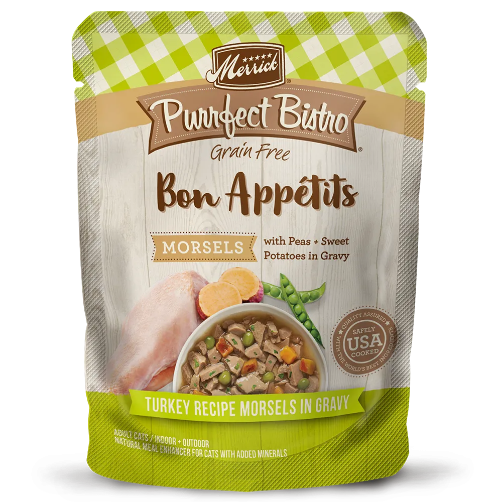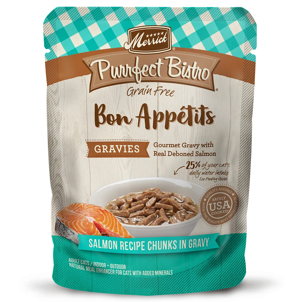 For cats who demand the finer things, we present Merrick Purrfect Bistro. Purrfect Bistro recipes are made specifically for each life stage, with dry cat food and wet cat food options that are expertly crafted for high quality nutrition. Available in grain free or with healthy grains options, Purrfect Bistro dry cat food features real deboned chicken or salmon as the first ingredient, contain high levels of Omega-6 and Omega-3 fatty acids for healthy skin and coat, and has added taurine, vitamins and minerals for natural dry cat food recipes. With wet recipes available in a variety of protein options and textures, you will be sure to find wet cat food perfect for your cat. Purrfect Bistro wet cat food recipes come in delectably smooth pates or chunks-in-gravy with a delicate sauce and add needed hydration to your cat’s diet. Add a topper to your cat’s mealtime with Purrfect Bistro Bon Appetits pouches, available as morsels in gravy recipes or chunks in gravy recipes with a range of protein options.