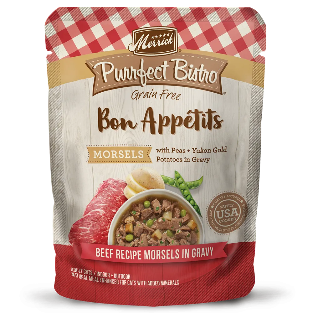 Merrick Purrfect Bistro Bon Appetits Beef Recipe Chunks in Gravy is a delicious wet cat food topper crafted with chunks made with beef in a gravy that adds moisture to your cat’s diet. This recipe comes in 3 oz pouches and is designed for supplemental feeding only.
